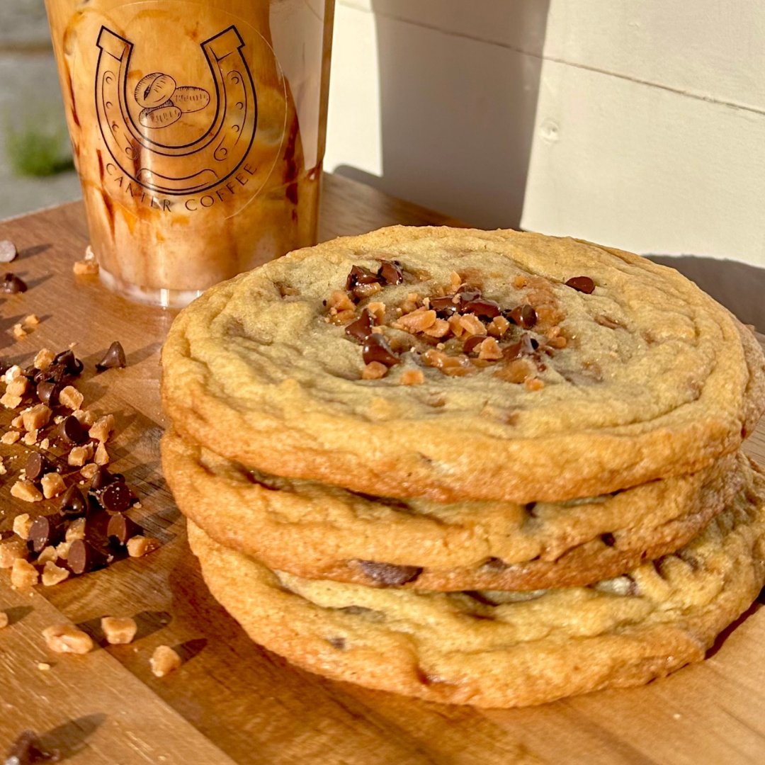 Freshly baked, chewy cookies! Some available flavours include; chocolate chip, Skor, M&M, chocolate toffee crunch, and white chocolate macadamia nut.